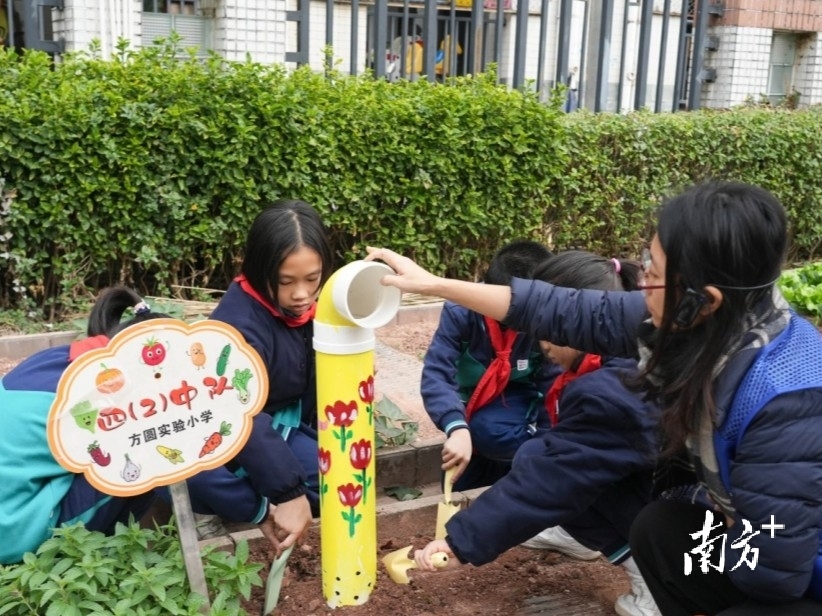 白云区方圆实验小学学生在生态科普课堂上学习植物知识,亲手种植植物。